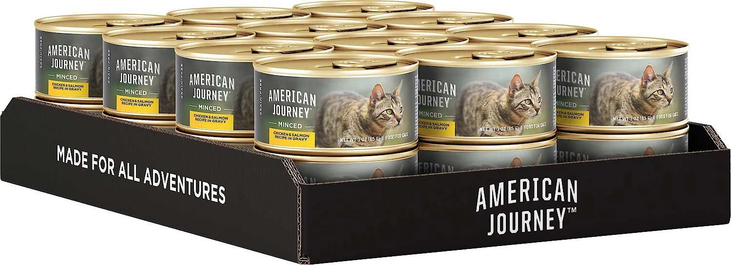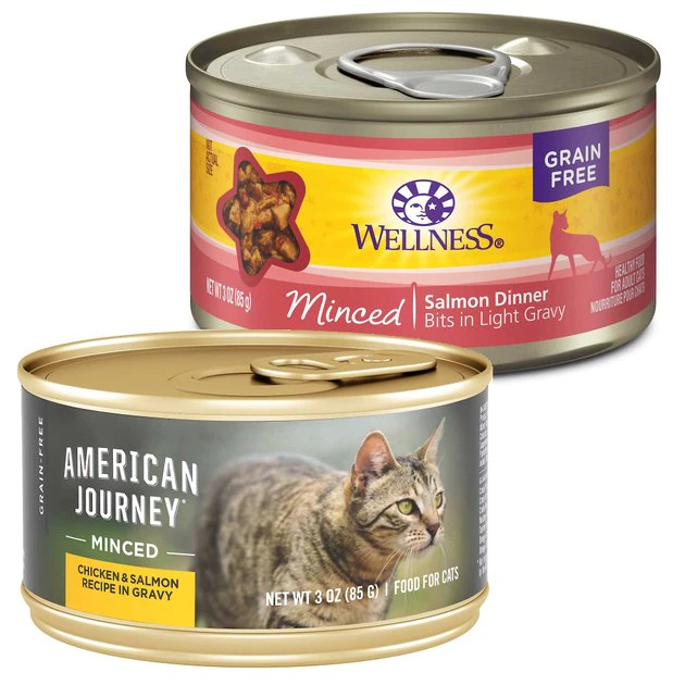 American Journey||Wellness American Journey Minced Chicken & Salmon Recipe in Gravy Grain-Free Canned Cat Food, 3-oz, case of 24 + Wellness Complete Health Natural Minced Salmon Dinner Grain-Free Canned Cat Food, 3-oz, case of 24