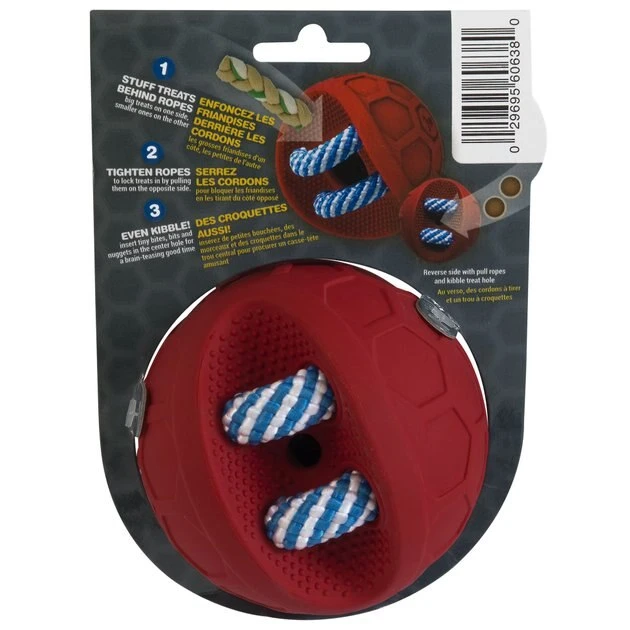 Turn treat time up a level with the JW Fits All Treat Ball Dog Toy! This puzzle toy provides your canine companion with mentally enriching playtime when you stuff your pal’s favorite treats or kibble within its rope nooks and crannies. Simply wedge the tasty morsel behind the ropes, tighten it and watch your inquisitive pal work to get a treat! This treat ball staves off boredom by providing your pooch with vital mental and physical enrichment Additionally, as he works for the treat, the rubber nubs and hexagonal surface texture help clean your pal’s teeth and gums, which can improve his overall dental health and the smell of his breath. It can accommodate a variety of treats in many shapes and sizes.