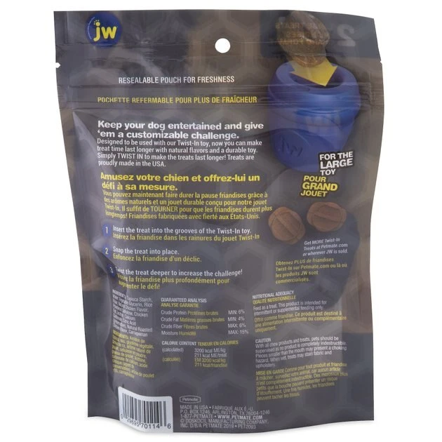 Made just for use with your Twist-In Treats Dog Toy (sold separately), JW Pet Chicken Flavor Large Refill Treats are sure to please your canine companion! They pack a delightful, long-lasting chicken flavor that dogs go crazy for. You’ll also love that the treats are made in the USA and come in a convenient resealable pouch to lock in freshness and flavor. Add a touch of tastiness to your pal’s playtime by stuffing their treat dispenser toy with a JW Pet Chicken Flavor Treat!