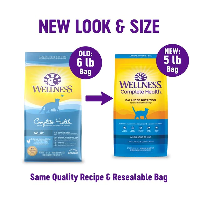 Give your feline friend a nutritious and delicious meal with the Wellness Complete Health Chicken & Rice Dry Cat Food. This dry cat food is filled with a balance of nutrients that is purr-fect for cats who engage in a moderate level of activity. Its recipe helps these cats stay healthy, energized, and happy for years to come. Even the most finicky felines will go head-over-tail for its mouthwatering chicken flavor! This recipe is made in the USA with non-GMO ingredients.