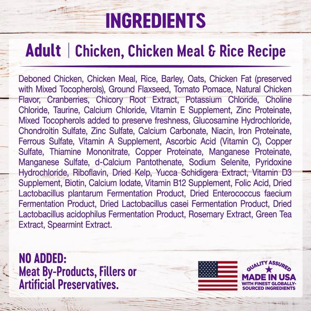 Deboned Chicken, Chicken Meal, Rice, Barley, Oats, Chicken Fat (preserved with Mixed Tocopherols), Ground Flaxseed, Tomato Pomace, Natural Chicken Flavor, Cranberries, Chicory Root Extract, Potassium Chloride, Choline Chloride, Taurine, Calcium Chloride, Vitamin E Supplement, Zinc Proteinate, Mixed Tocopherols added to preserve freshness, Glucosamine Hydrochloride, Chondroitin Sulfate, Zinc Sulfate, Calcium Carbonate, Niacin, Iron Proteinate, Ferrous Sulfate, Vitamin A Supplement, Ascorbic Acid (Vitamin C), Copper Sulfate, Thiamine Mononitrate, Copper Proteinate, Manganese Proteinate, Manganese Sulfate, d-Calcium Pantothenate, Sodium Selenite, Pyridoxine Hydrochloride, Riboflavin, Dried Kelp, Yucca Schidigera Extract, Vitamin D3 Supplement, Biotin, Calcium Iodate, Vitamin B12 Supplement, Folic Acid, Dried Lactobacillus plantarum Fermentation Product, Dried Enterococcus faecium Fermentation Product, Dried Lactobacillus casei Fermentation Product, Dried Lactobacillus acidophilus Fermentation Product, Rosemary Extract, Green Tea Extract, Spearmint Extract.