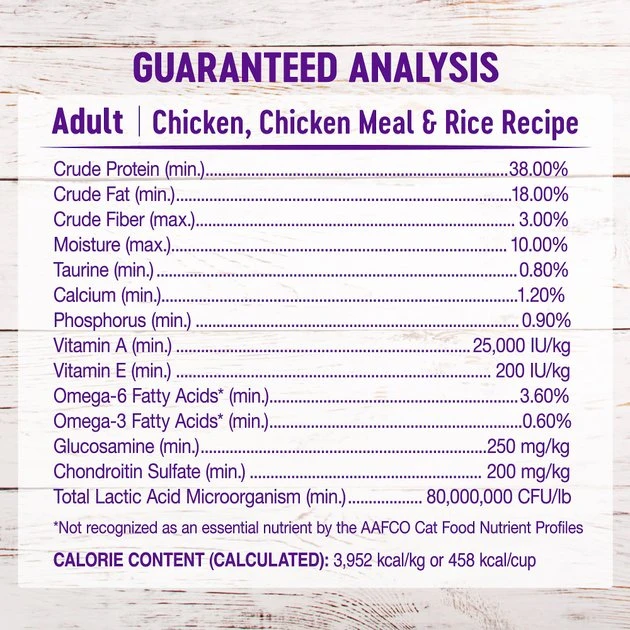 - Made with a blend of fat and protein, and with chicken as its first ingredient.
