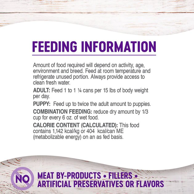 12.5 oz Can: Feed 1 can (12.5 oz) for every 15 lbs of body weight per day. Feed up to twice the Adult amount to puppies.