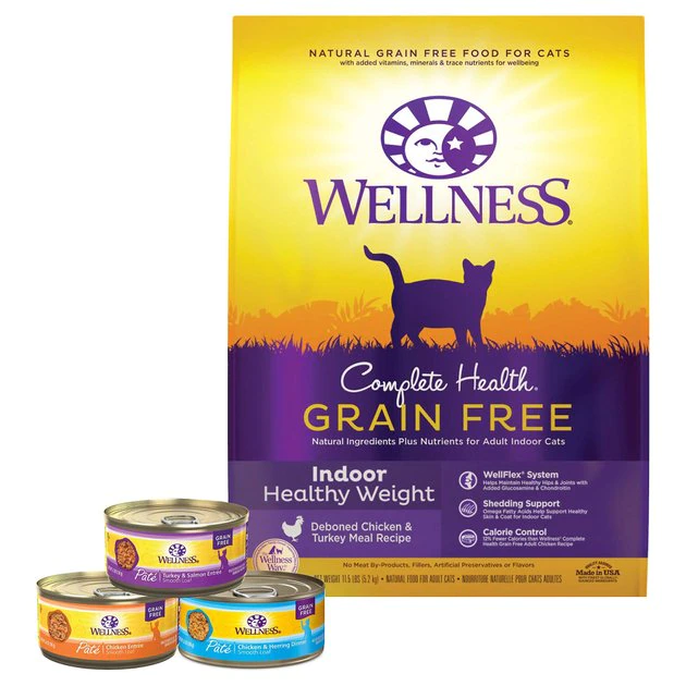 Give your indoor cat a big boost with Wellness Complete Health Poultry Lovers Pate Variety Pack Grain-Free Canned Cat Food + Grain-Free Indoor Healthy Weight Chicken Recipe Dry Cat Food. Each canned food recipe is packed with real turkey and chicken as the top ingredients, in a whisker-licking gravy that’ll keep him running to his bowl. Every bite is loaded with essential taurine plus vitamins, minerals and amino acids to support nose-to-tail well-being. And since it’s made with real broth, it also helps keep your kitty hydrated to support urinary health. And Wellness Complete Health’s dry food is everything your indoor cat needs, all in one bowl. With more of the protein your cat craves and no fillers like wheat, corn or soy, it’s easy to provide the nutrition your cat needs to thrive.