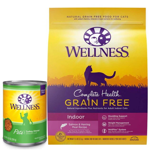 Nourish your kitty’s nose-to-tail well-being with the protein-rich nutrition of Wellness’s Complete Health food. Enjoy a variety of flavors in both wet and dry food with our Wellness Complete Health Turkey Formula Grain-Free Canned Cat Food & Wellness Complete Health Natural Grain Free Salmon & Herring Dry Cat Food bundle. These nutrient-dense, grain-free recipes contain all the protein your pal needs to support his strong muscles and energy to fuel all his adventures. Every bite is specifically formulated to match the needs of your kitty and keep him shiny, happy and healthy. Each recipe is made in North America and doesn’t include any wheat, corn, soy, meat by-products, artificial colors or flavors—just natural ingredients for a nutritious meal.