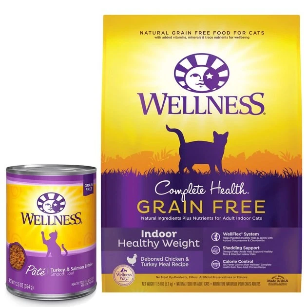Nourish your indoor kitty’s nose-to-tail well-being with the protein-rich nutrition of Wellness’s Complete Health food. With our Wellness Complete Health Turkey & Salmon Formula Grain-Free Canned Cat Food & Wellness Complete Health Grain-Free Indoor Healthy Weight Chicken Recipe Dry Cat Food bundle, you can support their overall well-being and ensure they’re getting all of the protein and nutrients that they need. Serve up a bowl and feel good about providing your pal with everything he needs to thrive and nothing you wouldn’t want him to eat, like fillers or anything artificial. Plus, the savory sauce will keep him coming back for more!