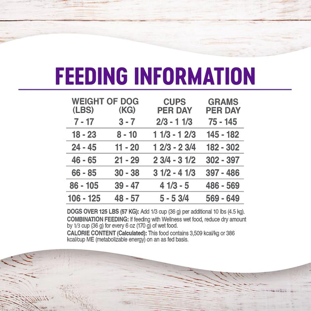 Combination Feeding: If feeding with Wellness wet food, reduce dry amount by 1/3 cup for every 6 oz of wet food