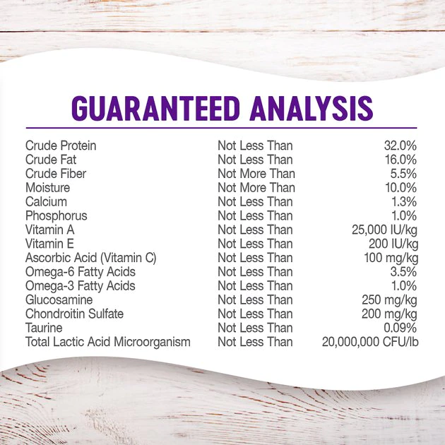 Minimum and maximum claims for each nutrient are established by AAFCO. The only necessary claims a pet food must make are for Crude Protein, Fat, Fiber, and Moisture. Protein is always a minimum claim Fat is always a minimum claim Fiber is always a maximum claim Moisture is always a maximum claimWhile these are the only nutrients mandated by AAFCO to carry min/max claims, ash may voluntarily be listed, but must be listed as a maximum guarantee. Any vitamins, minerals or live microorganisms (probiotics) may be labeled with a minimum guarantee. We’re proud to be one of the only pet food manufacturers who are able to include guaranteed levels of probiotics on our dry food recipes. Probiotics can help improve digestion and immune system function.