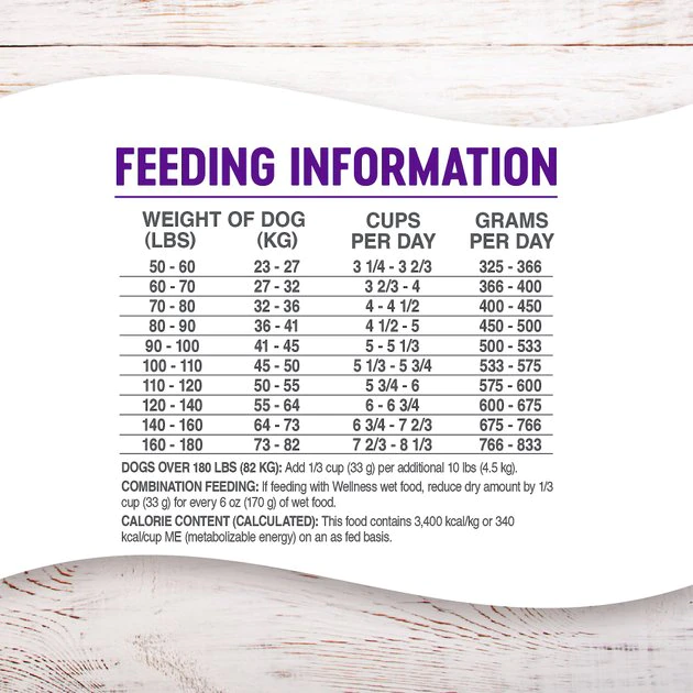 Combination Feeding: If feeding with Wellness wet food, reduce dry amount by 1/3 cup for every 6 oz of wet food.